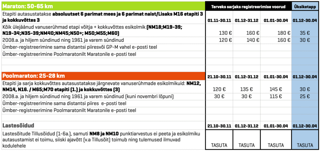 Registreerumise hinnad kogu hooajaks koos registreerumisvoorudega: